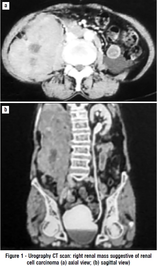 Laboratory examination showed normal complete blood count, blood chemistry, electrolyte levels, and urinalysis. A plain chest X-ray showed an elevated right diaphragm (suggestive of an intra-abdominal process) but found no sign of metastasis. Abdominal ultrasound indicated a right renal mass suggestive of RCC (differential diagnosis: urothelial tumor) with right hydronephrosis and found no metastasis to surrounding organs. Urography CT scan (fig. 1) visualized a right renal tumor suggestive of RCC.